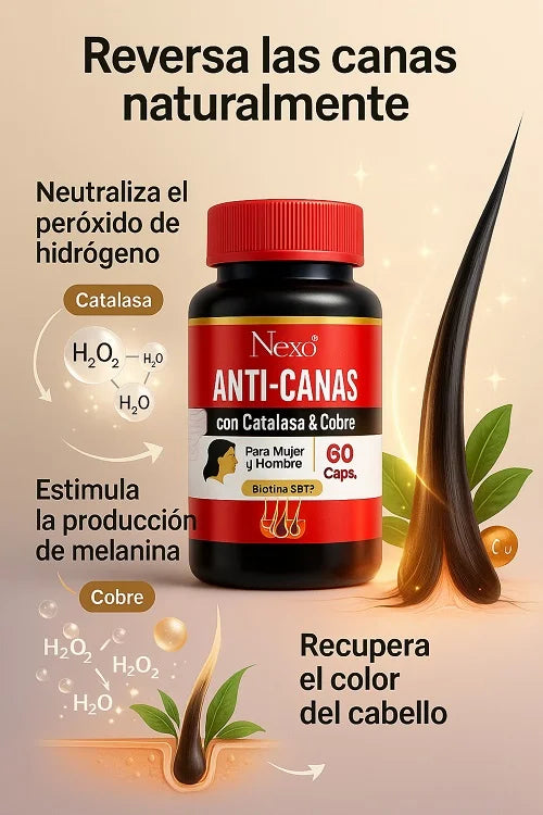 ¿Cansado de los tintes que solo esconden las canas por unos días? ¡Es momento de cambiar el juego! Nexo Anticanas es la solución natural que tu cabello necesita. Con una fórmula avanzada, este suplemento suizo transforma tu cabello desde adentro, neutralizando el peróxido de hidrógeno, estimulando la melanina y devolviéndole su vitalidad. ¡Tu cabello merece lo mejor!🫶